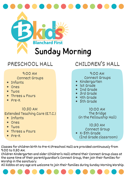 Children are a heritage, or gift, from the Lord! (Psalm 127:1) Blanchard First Children’s Ministry is committed to glorifying the one true God through the evangelism and training of our children in the things of the Lord. We view every circumstance in our classrooms as an opportunity to both share and demonstrate the Gospel. Our goal is to reinforce and encourage parents’ efforts to bring their children up in the discipline and instruction of the Lord (Ephesians 6:4; Deuteronomy 6:6-7).